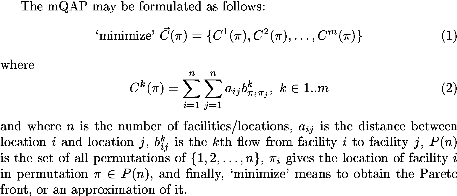 The multiobjective QAP (mQAP), with multiple flow matrices (defined below)