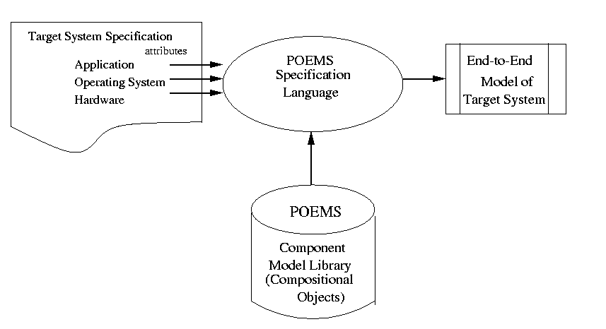The key innovation in POEMS is a methodology that makes it possible to compose multi-domain, multi-paradigm, and multi-scale resolution component models into a coherent system model. Multi-domain models integrate component models from multiple semantic domains; in the case of POEMS, these domains are application software, OS/runtimeOS/ runtime system software, and hardware. Multi-paradigm models allow the analyst to use multiple evaluation paradigms—analysis, simulation, or direct measurement of the software or hardware system itself—in a single system model. To facilitate the integration of models from different paradigms, the specification and implementation of POEMS models is accomplished through formulating component models as compositional objects with associative interfaces [11, 12]. Associative module interfaces extend conventional interfaces to include complete specification of component interactions. A specification language (the POEMS Specification Language or PSL) for specification of multi-domain, multi-paradigm, multi-resolution performance models has been designed and a compiler for this language is under development.