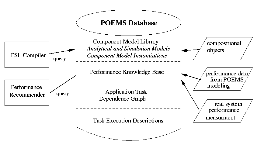 The project is alsoalso is building a knowledge base of performance data, gathered during the modeling and evaluation process, which can be used to estimate, as a function of architectural characteristics, the performance properties of widely-used algorithms. The knowledge base, along with the component models, application task graphs, and formal task executions descriptions (called TEDs), is stored in the POEMS database, an integral part of the POEMS system.