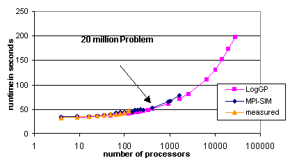 As discussed in Section 5, both analytical and simulation techniques can predict the performance of large-scale parallel applications as a function of various architectural characteristics. Simulation can model system performance at much greater levels of detail than analytical models, and can evaluate application performance for architectural modifications that would change the analytical model input parameters in unknown ways. As a simple example,For example, we used the MPI-Sim results were used to gain confidence in the very large-scale projections of Sweep3D performance from the LogGP model. On the other hand, because of the resource and time constraints of simulation, analytical models can elucidate the principal system performance parameters and can provide performance projections for much larger configurations than is possible with simulation models. Because of these complementary strengths, significant benefits can be derived from combining the two approaches.